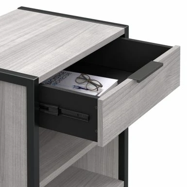 - Nightstand has 1 drawer and 2 open shelves (1 adjustable)