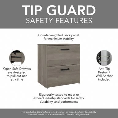 - Tip Guard(TM) safety features include a stable design, counterweighted back panel, wall anchor and Open-Safe Drawers