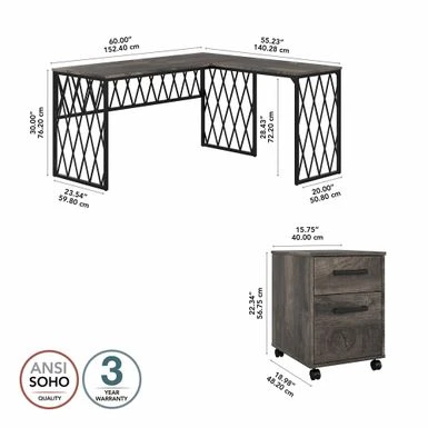 - Bundle includes: 60W Industrial L Shaped Desk, 2 Drawer Mobile File Cabinet