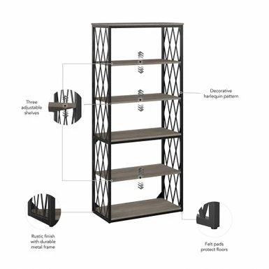 - Two shelves are fixed for stability while three adjustable shelves offer flexible placement for books and decor items