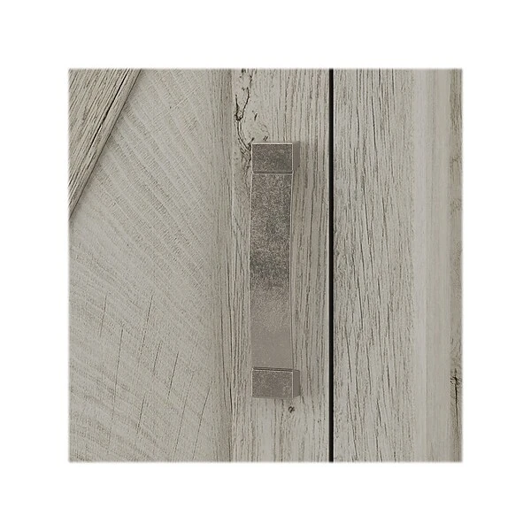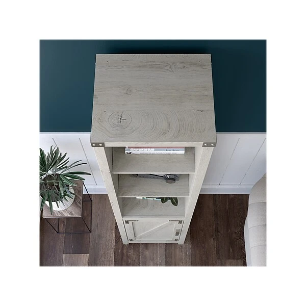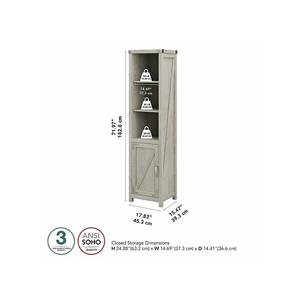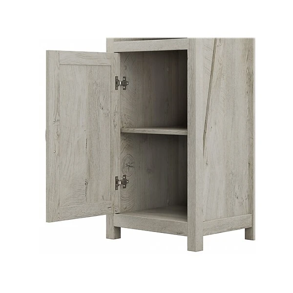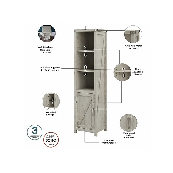 The kathy ireland Home by Bush Furniture Cottage Grove tall narrow five-shelf bookcase with door offers a practical storage and display solution with appealing modern farmhouse style. Use the top of the bookshelf to brighten up any room with pictures and decorations or organize a collection of paperback and hardcover books. Two of the upper shelves can be raised or lowered to accommodate items of various sizes, and the bottom storage cabinet also contains an adjustable shelf so larger materials can be kept in order but out of sight. Each shelf supports up to 50 lbs. Hardware is included to anchor the bookcase to a wall for maximum stability in your home office, living room, entryway, or any other residential space.