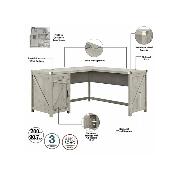 The Kathy Ireland Home by Bush Furniture Cottage Grove 60″W L-shaped desk with storage offers a personal workspace solution with appealing modern farmhouse style. Spread out with a computer, reference materials, and more on a durable corner desk surface that extends 60″ in each direction and supports up to 200 lbs. The desktop also includes built-in wire management to keep pesky cords and cables out of the way as you take on your next project or assignment. Additional materials and home office supplies can be stashed neatly inside the desk’s storage cabinet and box drawer. Save space in compact areas by placing the L-desk in a corner, or make use of the finished back to take a prominent position facing out into the room. This corner computer desk with storage has been tested to meet ANSI/SOHO standards for safety and performance and is backed by a 3-year manufacturer warranty.