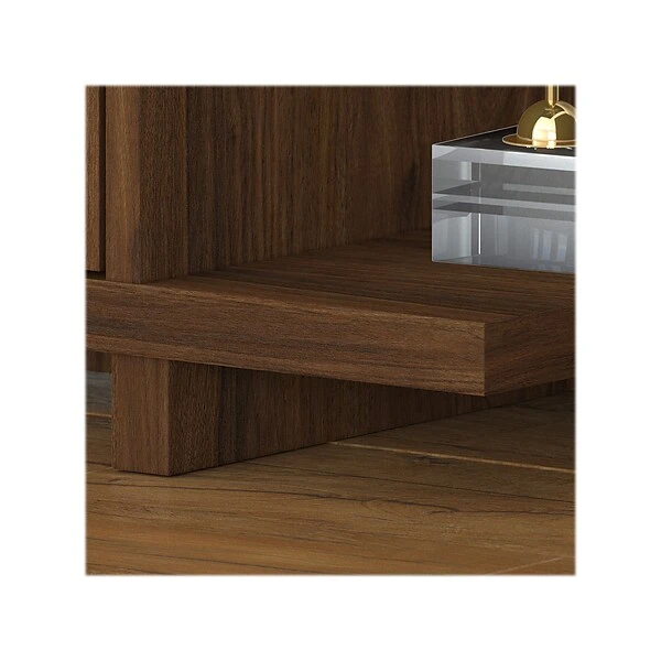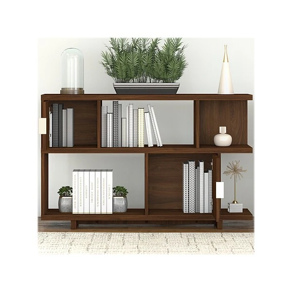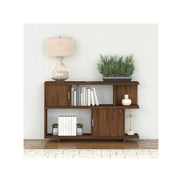 The stylish and progressive kathy ireland Home by Bush Furniture Madison Avenue console table with storage offers a perfect solution for maintaining an organized living space. Take advantage of the modern asymmetrical design to store household items and brighten up any common area with pictures and decorations. Two open shelves showcase books and home decor while two small cabinets conceal the materials you want to be hidden from view. Each tier supports up to 50 lbs., so you can use the table to confidently store and display larger items in a living room, hallway, home office, or entryway. The doors feature smooth Euro-style hinges for soft opening and closing. Find the perfect style to complement your space with three attractive finish options. This console table with storage is tested to meet ANSI/SOHO quality standards for safety and performance and is backed by a 3-year manufacturer limited warranty.