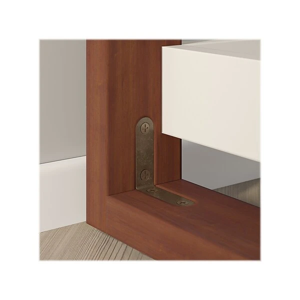 - Laminated composite wood console table in a Cotton White finish with Serene Cherry legs