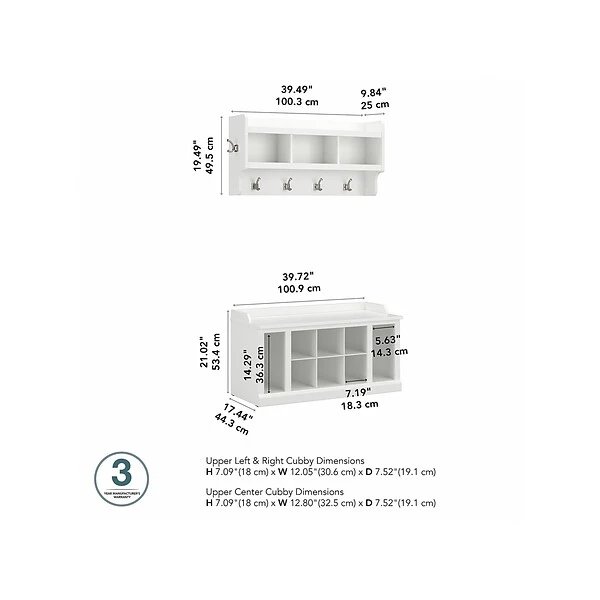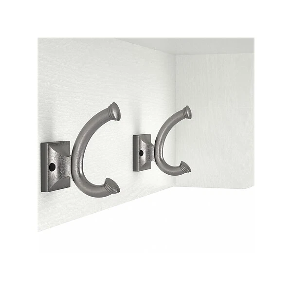 The kathy ireland Home by Bush Furniture Woodland shoe storage bench with shelves and wall-mounted coat rack combine transitional styling and a practical design to offer a perfect entryway organizer. Have a seat on the bench, and take a moment to relax as you get ready to head out the door or come home after a long day. The mudroom bench supports 250 lbs., so you can sit down to put on and take off your shoes or set shopping bags down after a trip to the store with confidence. Open storage that includes six cubby spaces and two vertical shelves on either side keeps footwear in order. The wall rack features six coat hooks for hanging jackets, hats, and scarves. Smaller items can be stashed neatly inside three open compartments. This entryway bench and coat rack set has been tested to meet Bush Furniture’s standards for safety, performance, and durability, and is backed by a 3-year manufacturer limited warranty.
