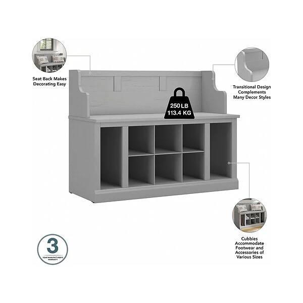 The kathy ireland Home by Bush Furniture Woodland entryway bench with shelves keeps footwear neat and organized for a clutter-free mudroom or foyer. The kathy ireland Home by Bush Furniture Woodland entryway bench with shelves combines transitional styling and a practical design to offer a perfect shoe storage solution. Have a seat on the shoe bench surface, and take a moment to relax as you get ready to head out the door or come home after a long day. The top of the mudroom bench supports up to 250 lbs., so you can sit down to put on and take off your shoes or set shopping bags down after a trip to the store. Open storage that includes six cubby spaces and vertical shelves on either side keeps footwear in order. This entryway organizer’s transitional design blends elements of contemporary and traditional styling to complement a wide range of home furnishings. This storage bench with back has been tested to meet Bush Furniture’s standards for safety, performance, and durability, and is backed by a 3-year warranty.