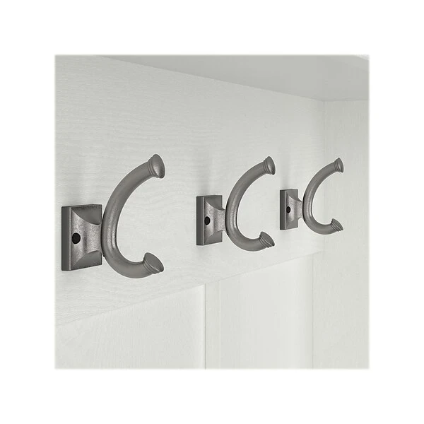 The kathy ireland Home by Bush Furniture Woodland 25″W coat rack and small shoe bench with shelves are great for keeping your entryway or mudroom in order. The kathy ireland Home by Bush Furniture Woodland 25″W coat rack and small shoe bench with shelves combine transitional styling and a practical design to offer an ideal entryway organizer. Have a seat on the durable bench surface, and take a moment to relax as you get ready to head out the door or come home after a long day. The mudroom bench supports 250 lbs., so you can sit down to put on and take off your shoes or set shopping bags down after a trip to the store. Six cubby spaces keep your home’s entrance organized while providing easy access to footwear. The narrow coat rack features five coat hooks for hanging jackets, hats, scarves, and more. Smaller items can be stashed neatly inside two open compartments. This entryway bench with storage has been tested to meet Bush Furniture’s standards for safety, performance, and durability and is backed by a 3-year warranty.