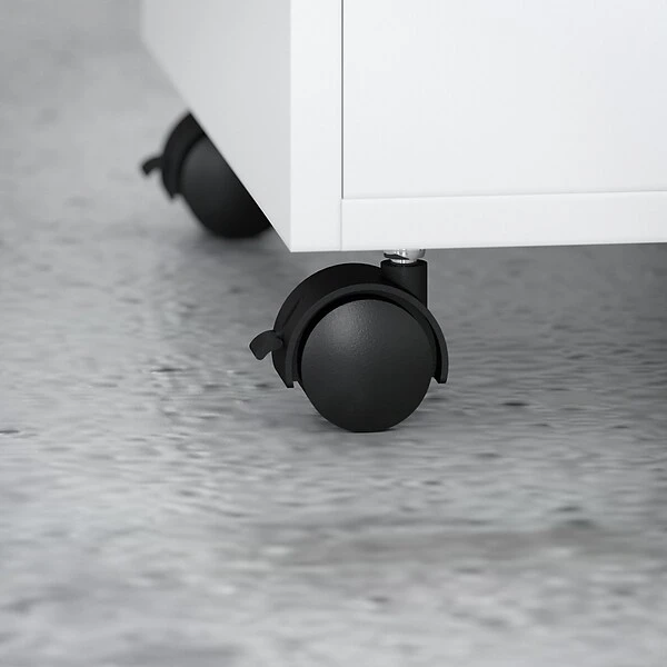The Office by kathy ireland® Echo L Shaped Desk with Mobile File Cabinet offers an elegant, functional design to inspire today’s professional. Wide lines and a thick surface create a strong presence while a thermally fused laminate finish protects the white Desk throughout years of daily use. Spread out on the spacious L Shaped surface with your computer, paperwork or any other tasks of the day. Attach the Return to either side of the Desk to form a left or right-handed layout. Make organization easy with the Mobile File Cabinet, which provides two box drawers to store office supplies and a full-extension file drawer. Drawers glide on smooth ball-bearing slides for a trouble-free open and close, while the Cabinet rolls effortlessly on dual-wheeled hooded casters. From Office by kathy ireland® and Bush Business Furniture, Echo comes with a 3 Year Warranty and meets ANSI/BIFMA standards.