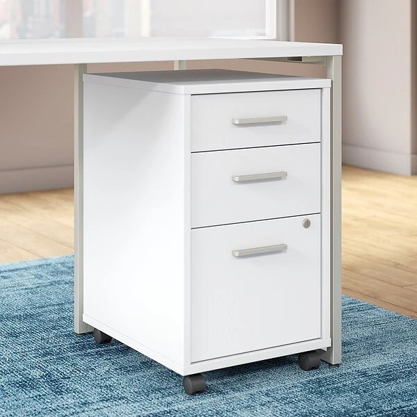 Embrace the unique styling of mid century modern design and enjoy flexible storage with the Office by kathy ireland® Method 3 Drawer Mobile File Cabinet. Constructed of 100% thermally fused laminate, the filing cabinet fends off scratches and stains and offers beautiful titanium finished hardware. Move your files around the office with ease as the modern cabinet rolls on smooth casters. Organize your paperwork in the full-extension file drawer, which opens effortlessly on ball-bearing slides. A lock secures the lower two drawers for your privacy, and the Mobile File Cabinet fits conveniently under your desk. Use the box drawers to clear your office from clutter and keep supplies by your side. From Office by kathy ireland® and Bush Business Furniture, the Method collection comes with a 6 Year Warranty and meets ANSI/BIFMA standards. American made with U.S. and imported parts.